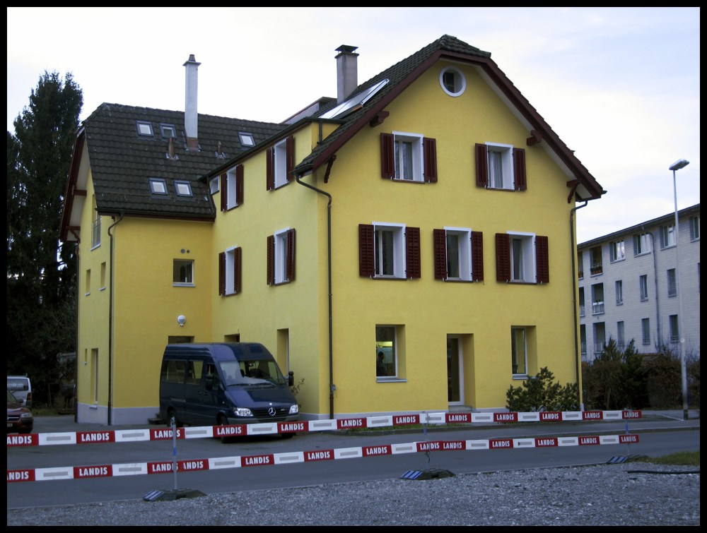 Die Südostecke nach dem Umbau. Auf dem Dach sind die Sonnenkollektoren erkennbar, die für das Warmwasser zuständig sind. Nur knapp sichtbar ist der an der Nordseite neu angebaute Treppenturm. Es war wichtiges Anliegen der Bauherrschaft, das Gebäude aus diesem Blickwinkel nur wenig zu verändern.