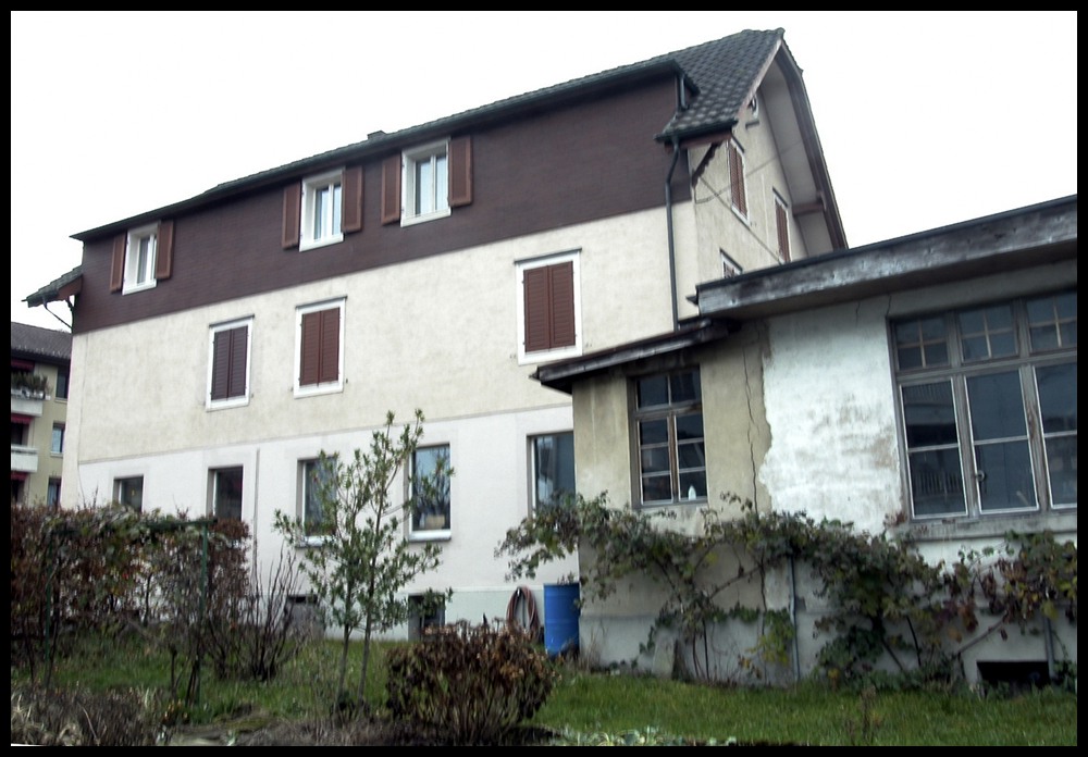 Die Nordfassade vor dem Umbau, mit dem nicht besonders schönen, eternitverkleideten Dachausbau.