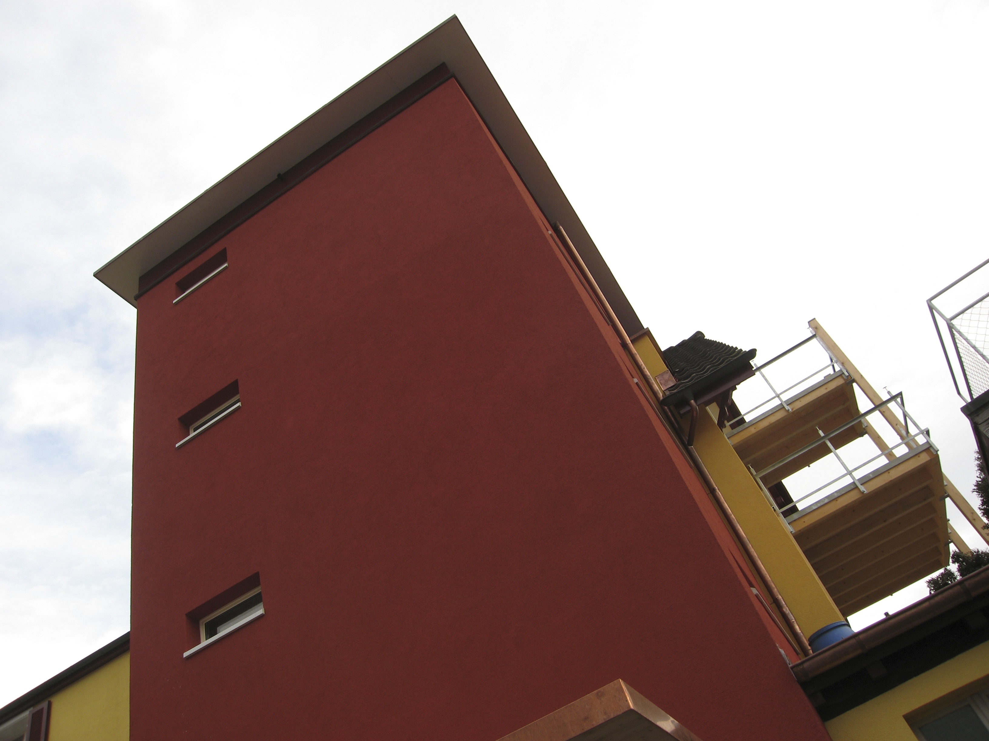 Der neue Treppenturm an der Nordseite des Gebäudes aus der Froschperspektive. Er ist in isolierendem Einsteinbacksteinmauerwerk ( Dicke: 36.5 cm) gemauert.