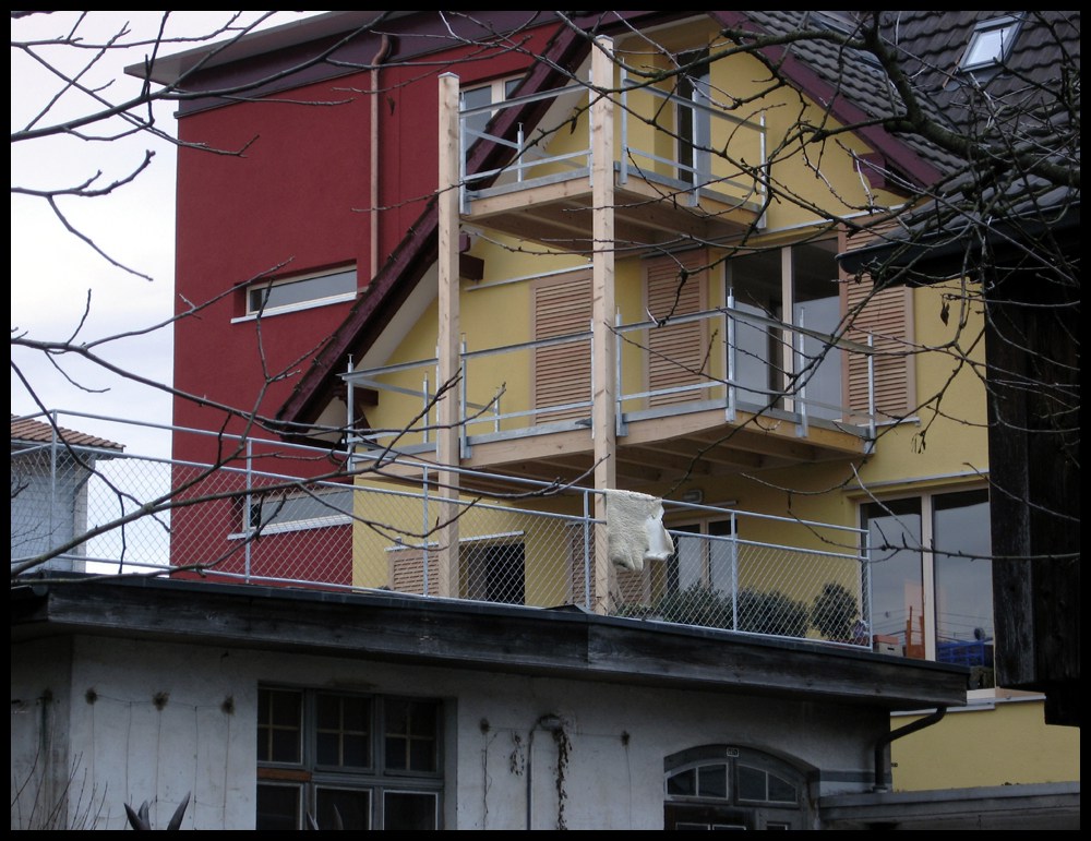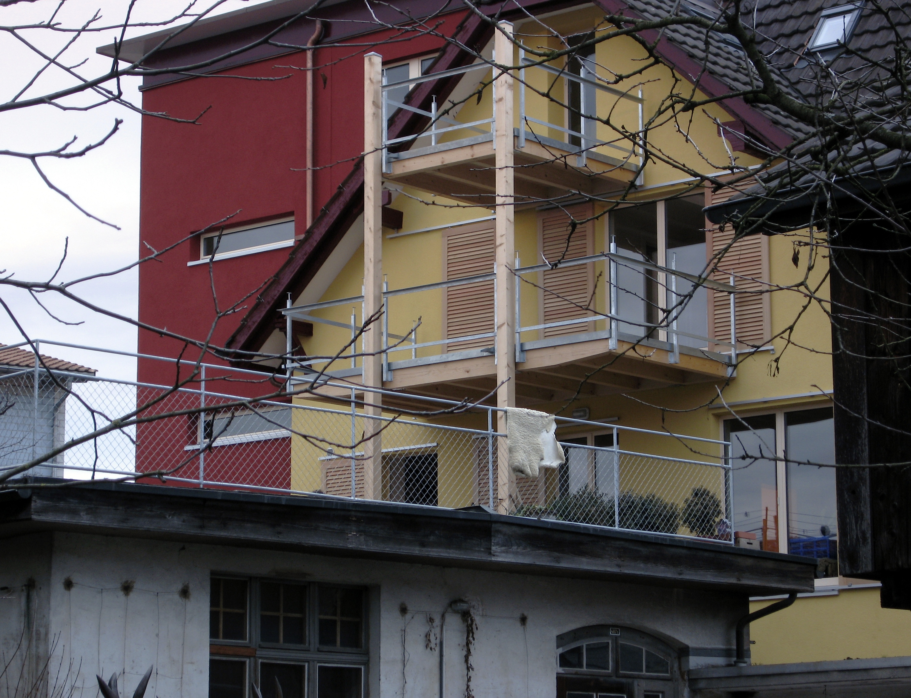 Die Balkone auf der Westfassade. Der Zugang erfolgt über die neuen Fenstertüren mit den Schiebeläden. Das DAch des Werkstattanbaues wird als grosse Terrasse der Wohnung im 1. OG genutzt.