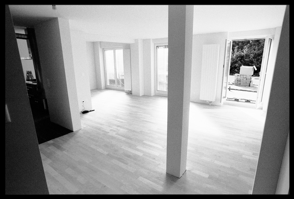 Der neue grosse Wohnraum im 1.OG vom Vorraum her gesehen, mit den Fenstertüren zur Terasse.