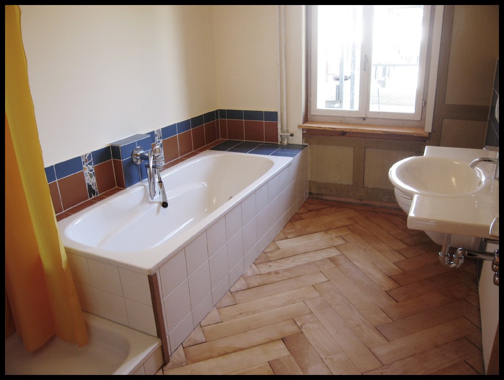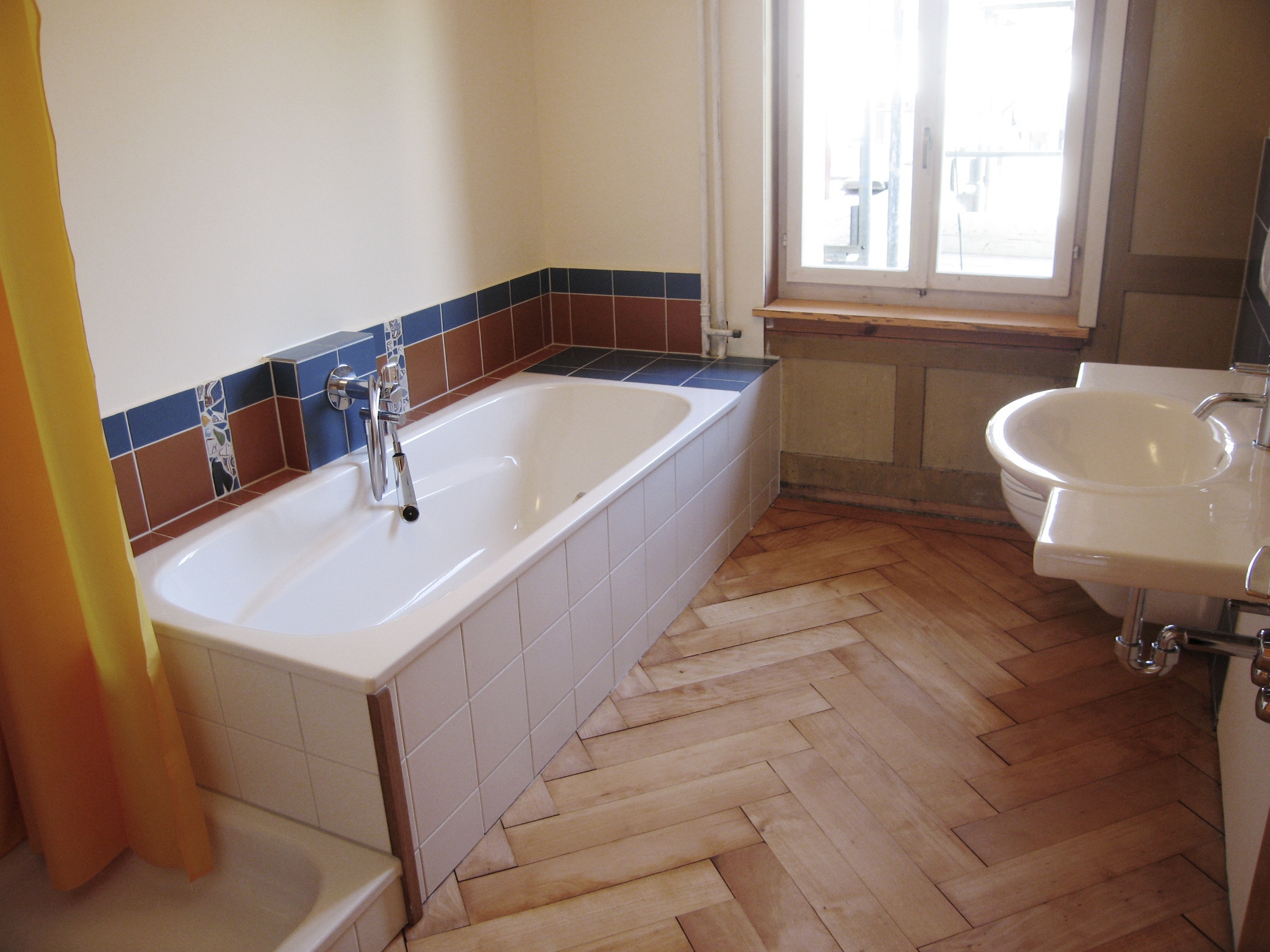 Das ehemals eher kleine Zimmer wurde zu einem grosszügigen Badezimmer umfunktioniert. Der alte Parkettboden wurde abgeschliffen und geölt. Er verleiht nun dem Raum eine ganz besondere Stimmung.