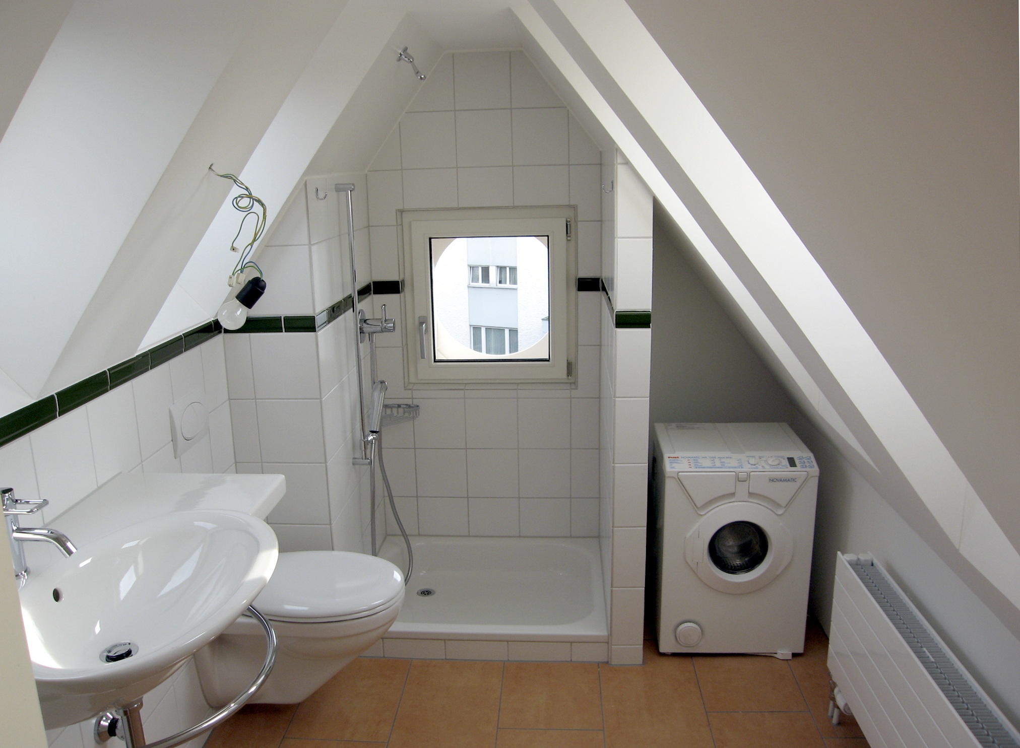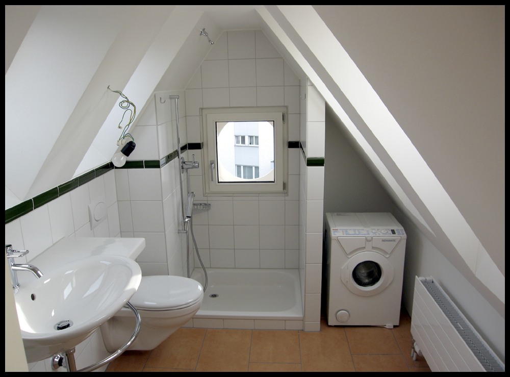 Du-WC im Dachgeschoss. Dank der beidseitigen Dachfenster vor und über dem Waschtisch und dem WC schlägt man bei der Benutzung den Kopf nicht an der Decke an, obwohl die Raumhöhe an sich nur auf einer Breite von 30 cm ausreichend ist. Gleichzeitig wird der Raum gut ausgeleuchtet und bietet auch etwas Aussicht.