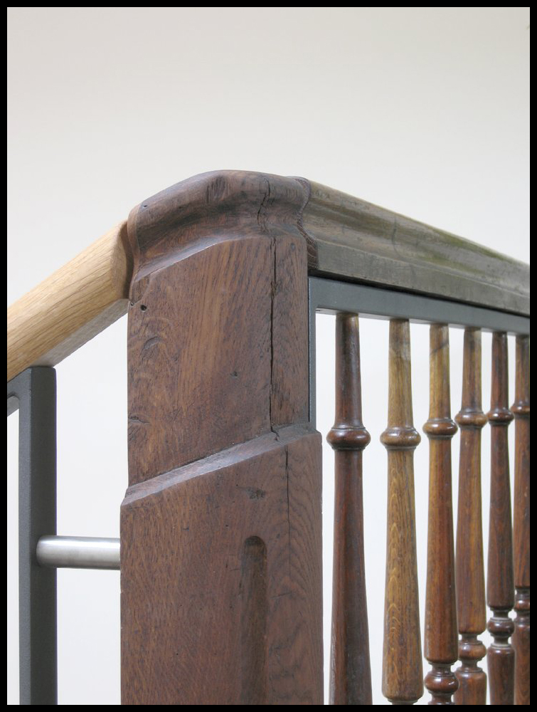 Alte und neue Elemente treffen aufeinander: alle Metallteile sind neu, ebenso der helle Holzhandlauf. Alle übrigen Holzteile sind schon an der ursprünglichen Treppe am alten Standort verwendet worden.