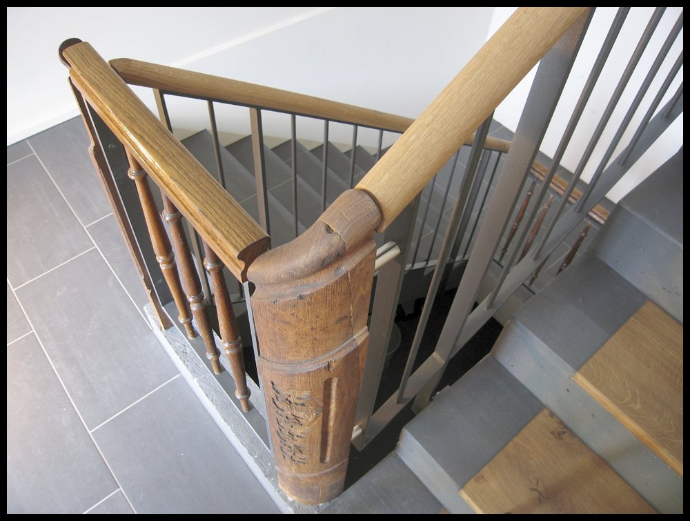 Im Erdgeschoss kommt das alte Endpfostenelement mit dem geschnitzten Blätterornament zum Einsatz.