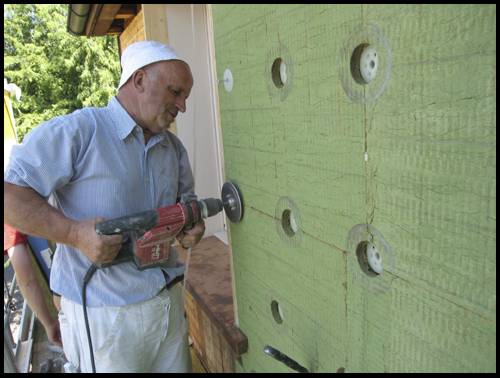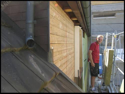 Im 2.OG wird die aussendämmung uf die alte Holzschalung montiert: