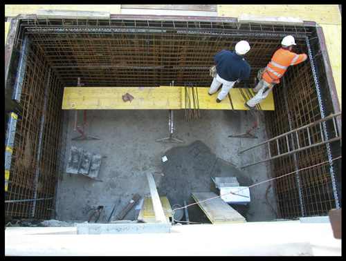 Silbrig der EBEA-Anschluss für die neue Bodenplatte im Zwischenbau:
