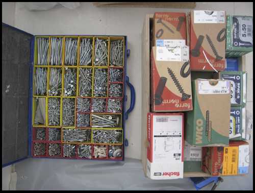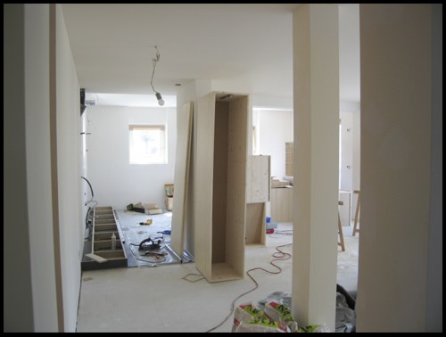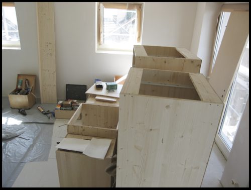 Der Schreiner schlägt die vom Bauherr gebaute Holzküche an: