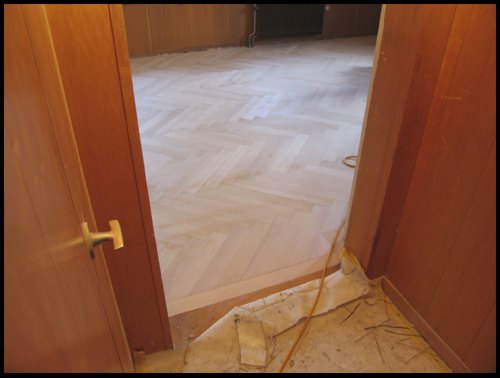 Im Zimmer 2 ist der alte Parkettbelag geschliffen worden:
