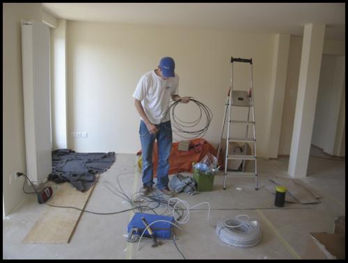 Der Elektriker räumt sein Material weg, nachdem alles angeschlossen ist: