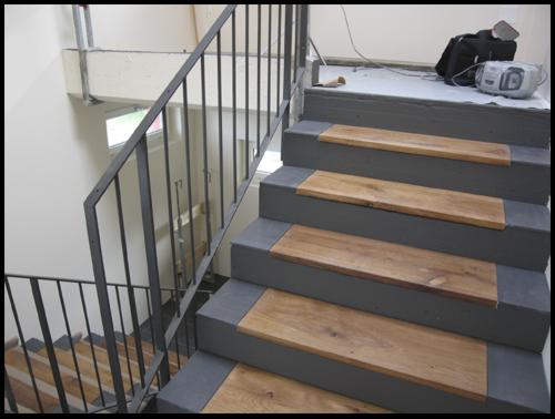 Die Treppe mit fertigem Belag und fertig gestrichen. Nur das Geländer ist noch