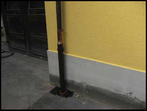 Die Sockelrohre der Dachwasserabläufe sind montiert:
