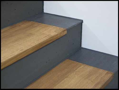 Die Kittfugen auf den Treppenstufen zwischen Holz, Fliesen, Beton und