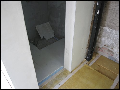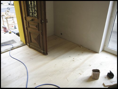 Auf der anderen Gebäudeseite baut der Zimmermann den Holzboden im