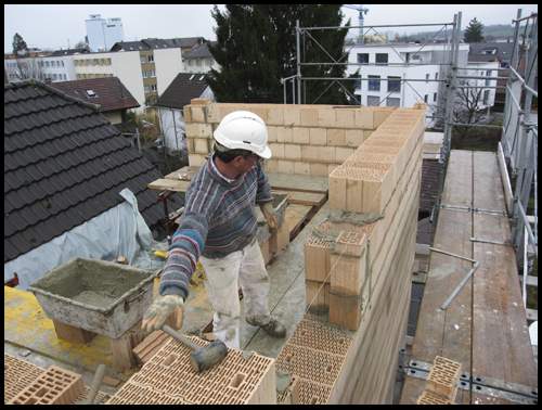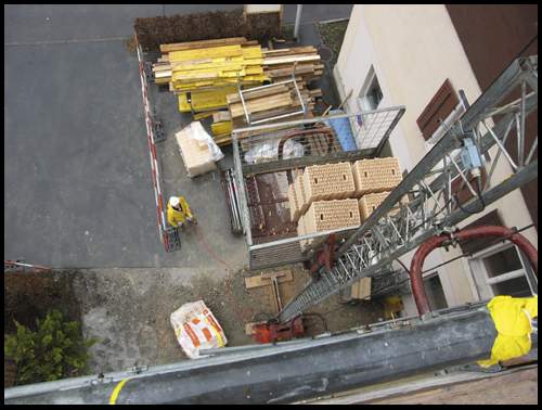 Mit dem Gerüstlift werden die Steine hochgefahren: