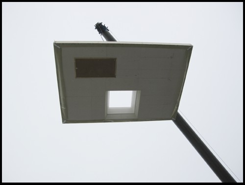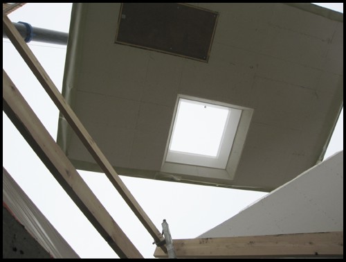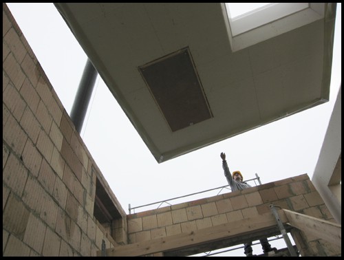 ...und bald schweben die Elemente ein. Das Oblicht und die Flachdach-