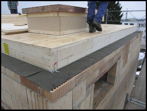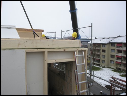 ...und wird zentimetergenau auf dem Mauerwerk und der bereits gestellten