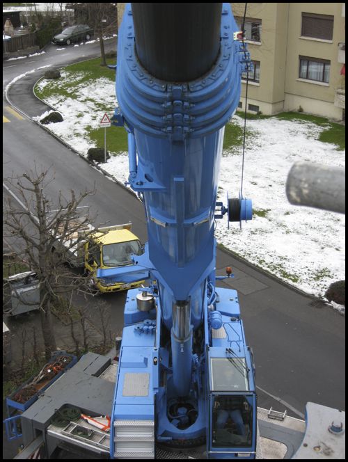 der Zimmermann bringt heute die Holzelemente. ein grosser Mobilkran wurde