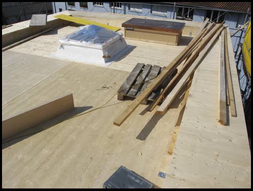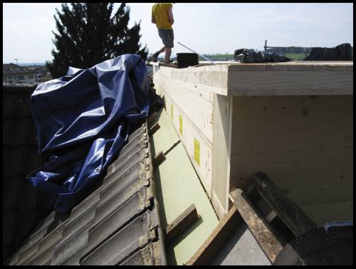 Und auf dem Dach oben bereitet der Zimmermann die Anschlüsse vor für die