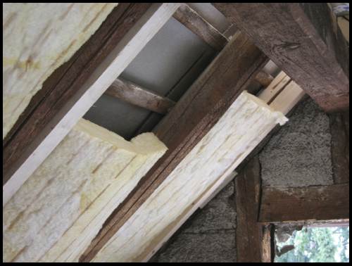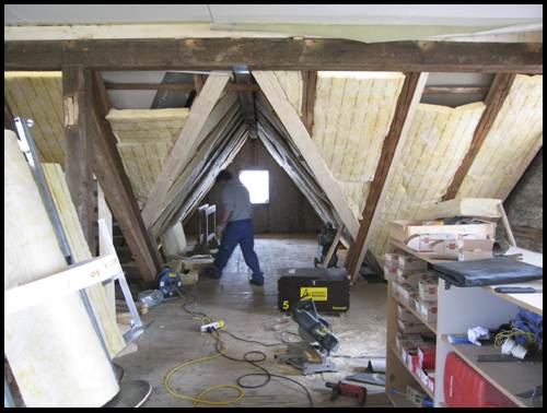 Unterdessen montiert der Zimmermann im DG die erste Schicht Dämmmatten: