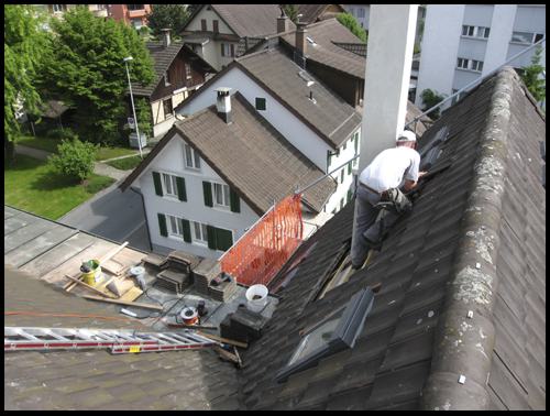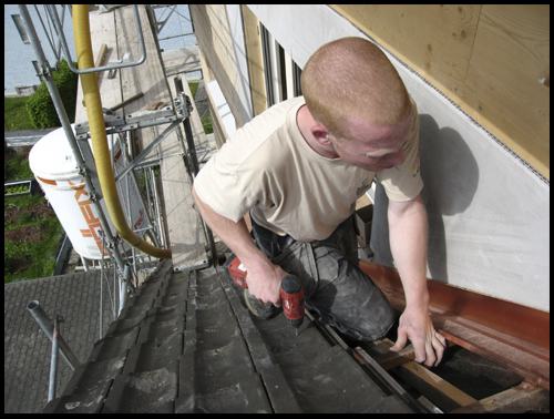 An der Westfassade werden Blechanschlüsse und Blechabdeckungen