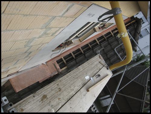 Der Schornstein ist verputzt, die Blecheinfassung ist angebracht und der