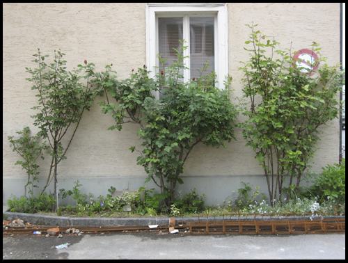 An der Südfassade müssen die in Blüte stehenden Rosenbüsche geschnitten,