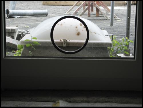Das Fenster mit dem Ausschnitt für das Katzentürchen ist eingebaut, deutlich