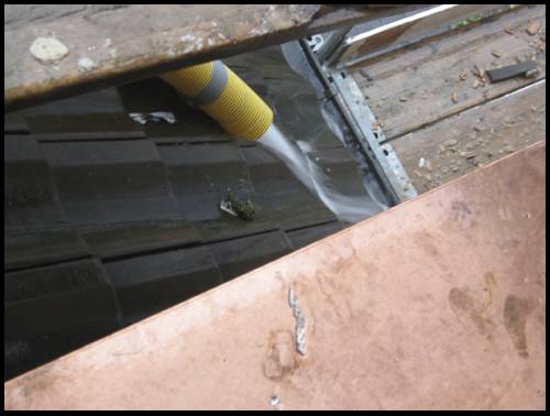 Flachdach wird über die provisorische Leitung in die alte Rinne geführt: