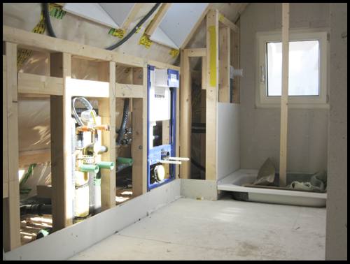 Im Innern ist im DG-Sanitärraum alles bereit für die Beplankung: