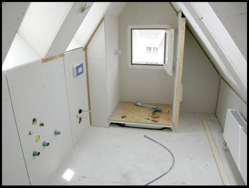 Im DG-Sanitärraum ist fast fertig beplankt. Rechts neben der Dusche ist die