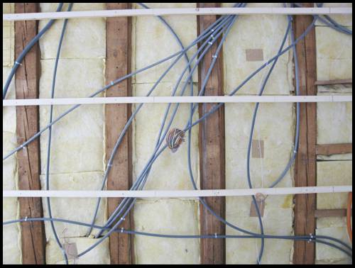 In den Westräumen ist diese Arbeit bereits vollendet. Im Bild sieht man die Decke im Eingangsraum mit der Elektroverteilung, die zum Teil auch zum 2. OG gehört: