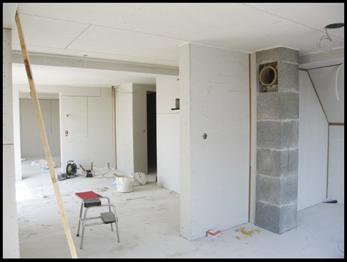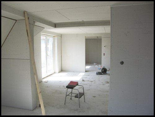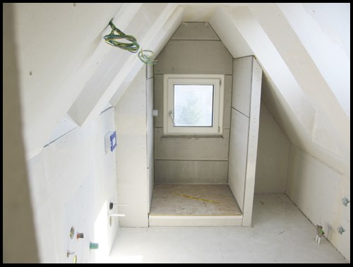 Das Bad im DG ist fertig gespachtelt, bereit für den Weissputz und die Plättli: