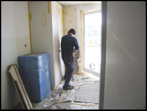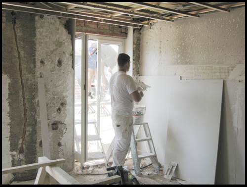 Der Gipser verkleidet im 1.OG die alten, verputzten Wände mit Fermacellplatten: