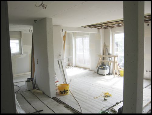 Nachdem die Wände beplankt sind, kann nun im Wohnraum im 1.OG auch die