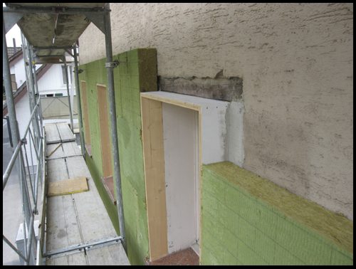 Die Aussendämmung wird im OG um die verlängerten Fensterfutter angebracht: